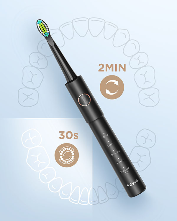 مسواک برقی Fairywill E11 Sonic جدیدترین طراحی با آخرین تکنولوژی مسواک را ارائه داده است. E11 Sonic Electric Toothbrush از مدرن ترین تکنولوژی مسواک برقی با حداکثر 40000 لرزش صوتی در دقیقه استفاده می کند. از طریق ارتعاشات صوتی تا 40000 ضربه در دقیقه انجام میدهد تا به طور موثر تا 100٪ بیشتر لکه های سطحی را نسبت به مسواک دستی از بین ببرد.